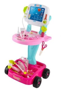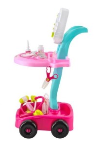 CARRELLO + 18 ELEMENTI - 18 prodotti medici e un carrello a 2 stadi con schermo e impugnatura ECG imitati consentono un gioco vario, creativo e multiplo.