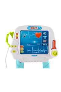 Quando viene premuto, lo stetoscopio produce un battito cardiaco e una lampada a forma di cuore si illumina. Il termometro e il cardiofrequenzimetro hanno un controllo a scorrimento per la regolazione della misurazione e un Display illuminato. L'otoscopio e lo specchio dentale sono illuminati. Gli elementi sono realizzati con cura con materiali innocui per la salute. Hanno bordi lisci e la loro forma li rende facili da afferrare e tenere in mano.